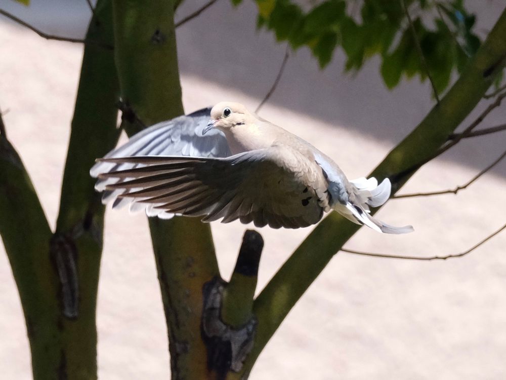 Mourning Dove protecting his young. A pair of mourning doves was chasing away a scrub jay that had got too close to the young one. This is a picture of the male in flight - ballet in motion.