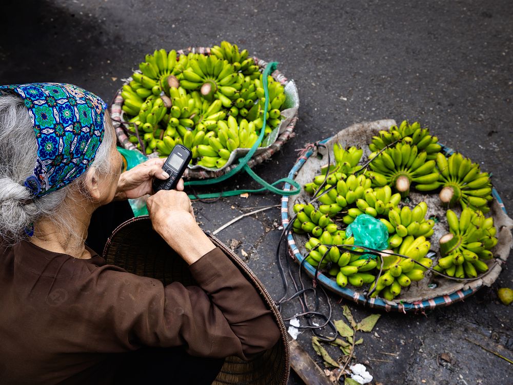 An old lady sells bananas. Today in the 4.0 era, selling goods does not necessarily have to go to the market. Let's join hands to help bring technology to the elderly, to make their lives less difficult. I took this photos when I walk at the biggest Ha Noi market (Dong Xuan market).
