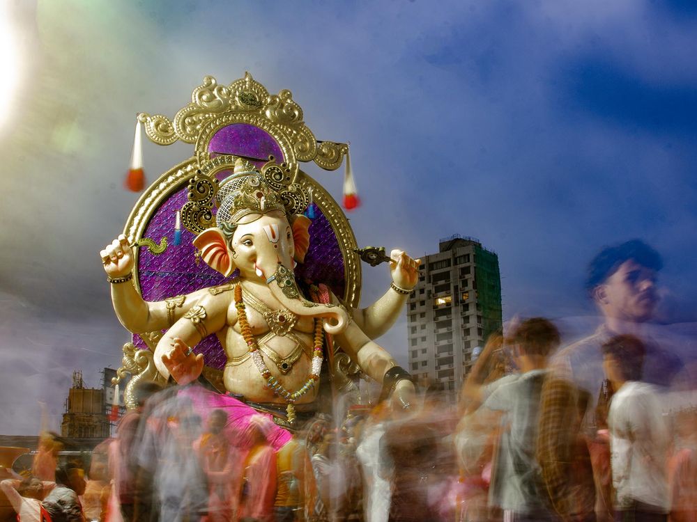 In the pale blue light of early morning, a massive Ganesha idol moves through Mumbai’s streets on its way to the sea. People surge around the chariot, blurred by the long exposure into a human tide, while high‑rise buildings loom quietly in the background. The photograph freezes the delicate balance between ancient ritual and a fast‑paced modern city.