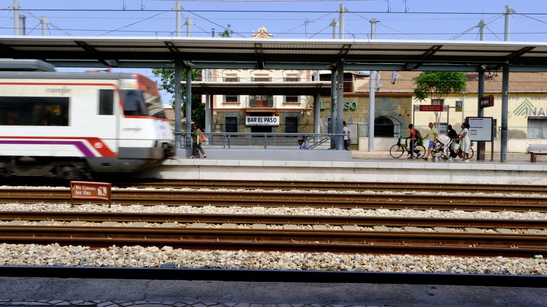 The train arrives at the train station in Sagunto, Spain.