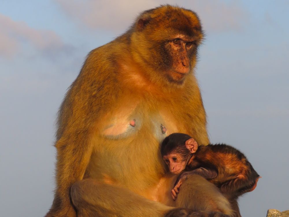 Atop the Rock of Gibraltar, a Barbary Macaque infant adjusts its position while the mother stares thoughtfully into the distance.