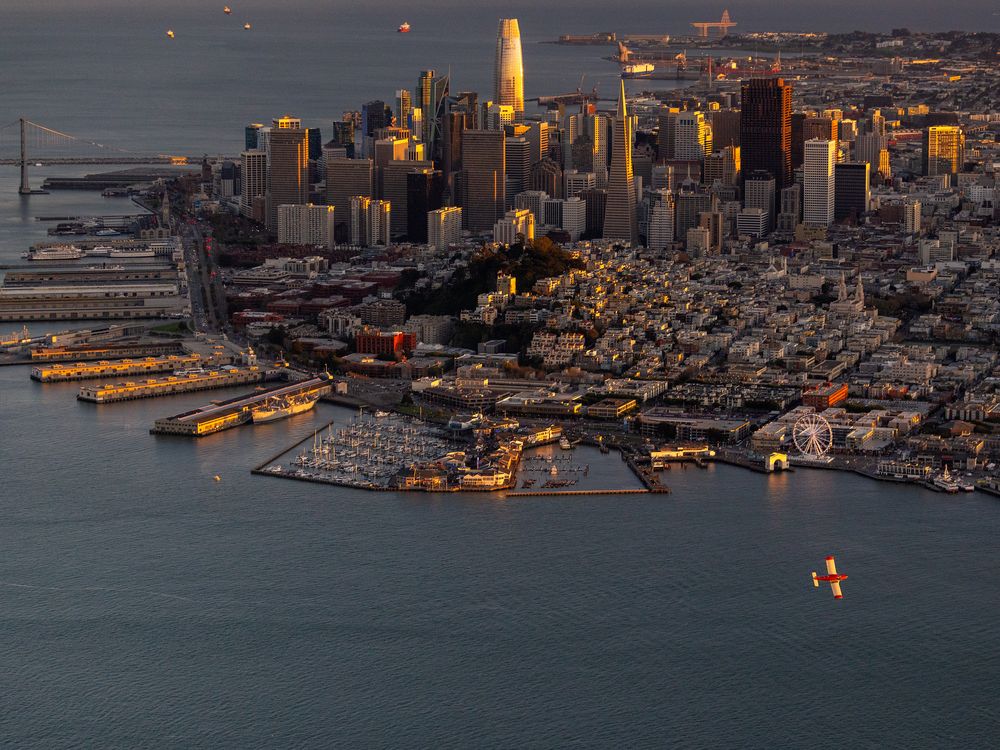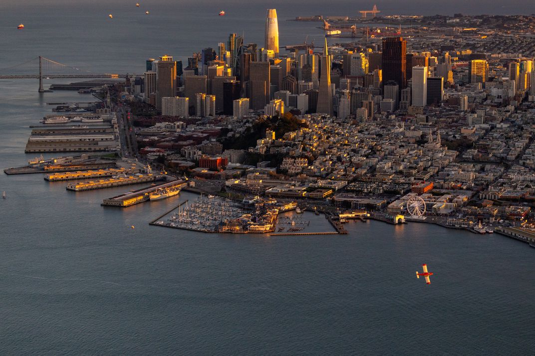 At sunset, a small plane flies over the San Francisco waterfront, passing the piers, the ferry terminal and the downtown towers. Seen from another small aircraft, the city’s hills, streets and harbor sit in one frame, showing how closely San Francisco is tied to the bay.