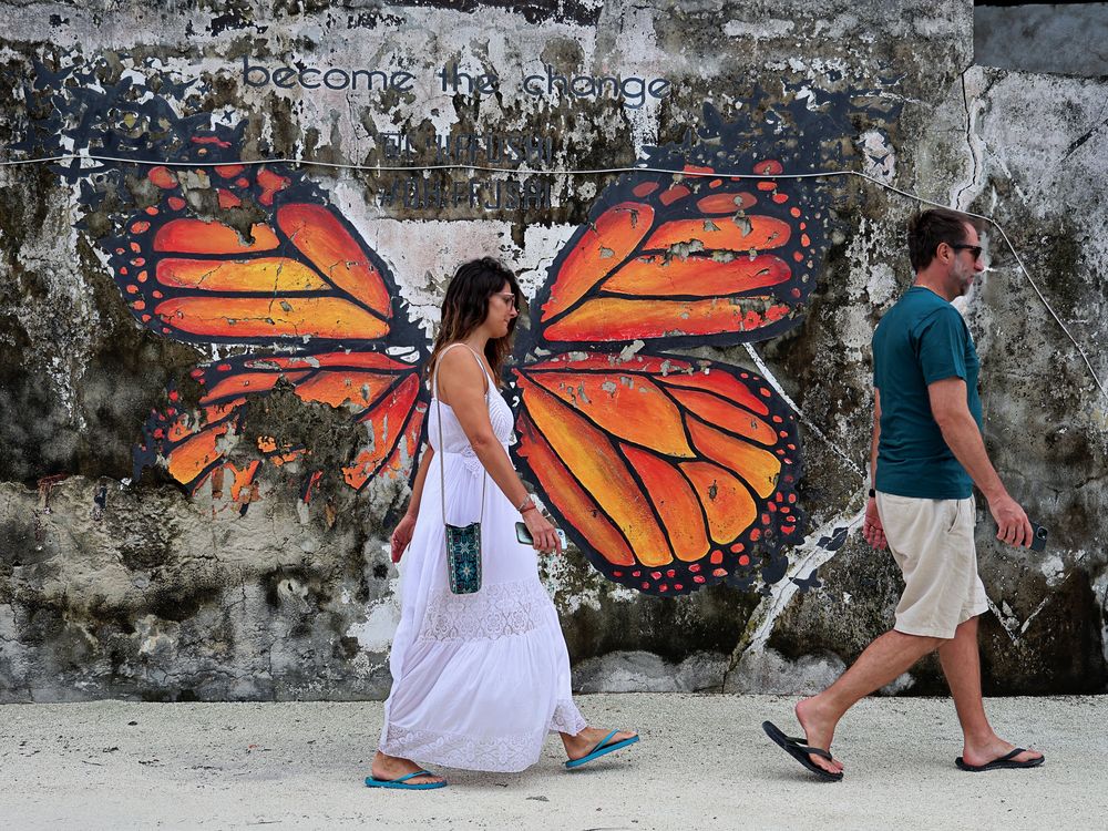 In front of a colorful mosaic wall, a lady in a purple ao dai and a conical hat is strolling elegantly, while someone is passing by on a bicycle loaded with flowers. The dragon patterns and red flower designs on the wall complement each other, full of exotic artistic flavor, presenting a unique scene of the fusion of street culture and art.