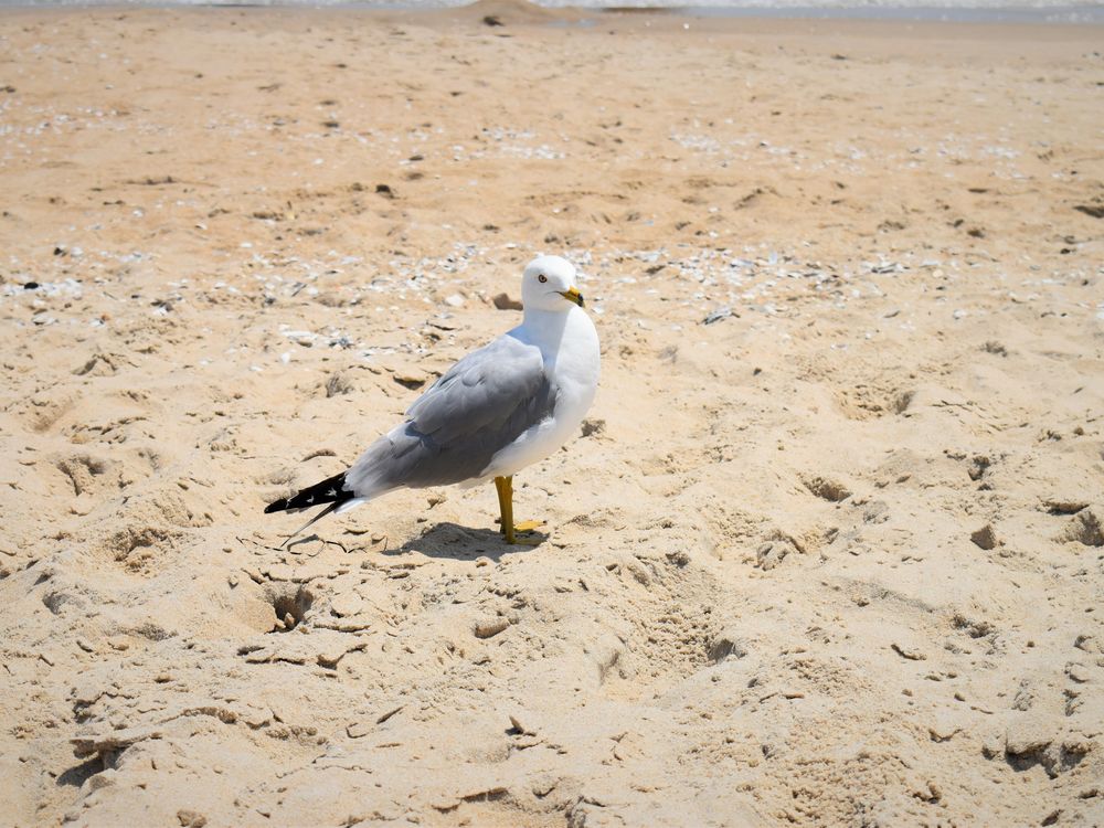 A bird standing in the sand at the beach.