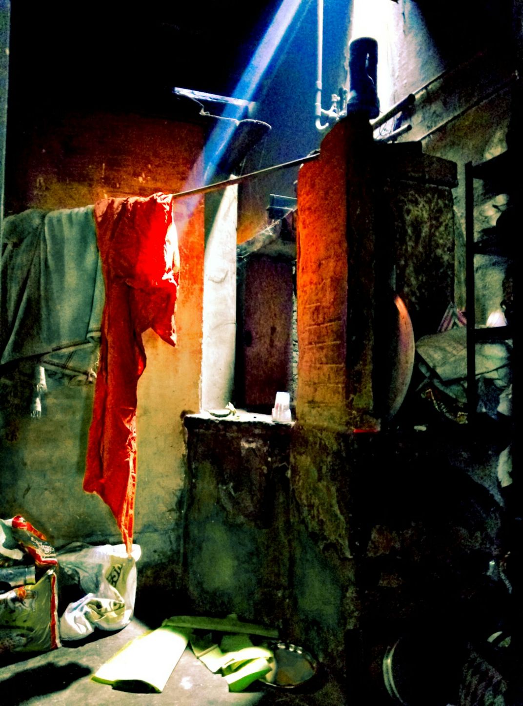 The corner well in the kitchen of an 100yr old temple in Mysuru, India which is about to be demolished. The kitchen gets little direct sunlight during day except for a short duration in the noon when few beams creep through an orifice in the ceiling.