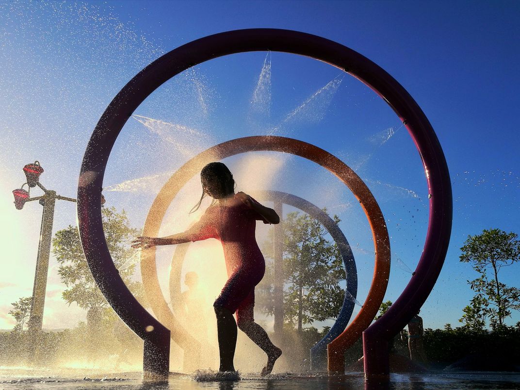 Kids beating the heat of summer by enjoying the water play of a mall in Cebu City, Philippines.