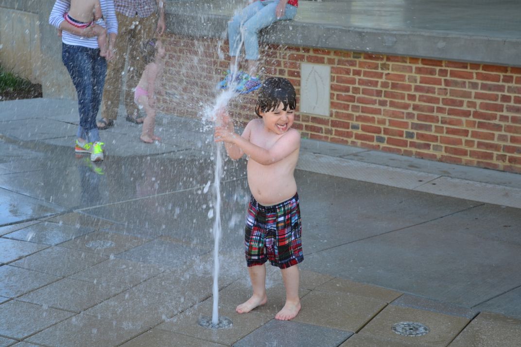 We were strolling through the downtown area of Roanoke, VA and it had gotten a little hot due to the midday sun. There is an ampitheater there with water jets shooting up randomly and we were able to kill two birds with one stone; cool down and have fun! Pretty soon a bunch of children had joined in (with and without parental permission) to enjoy the free water works!