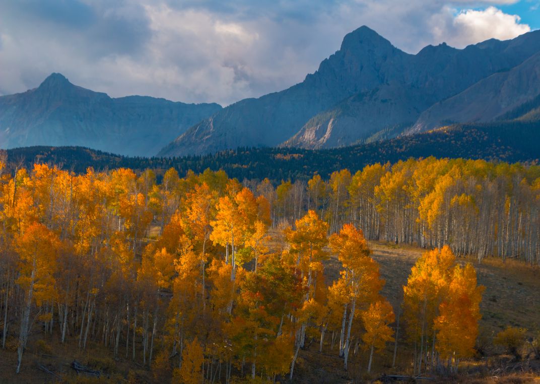 The leaves on the aspen trees are beautiful as they change colors in the fall. These aspens were found along the Last Dollar Road in Colorado between Ridgway and Telluride. The San Juan Mountains are in the background.