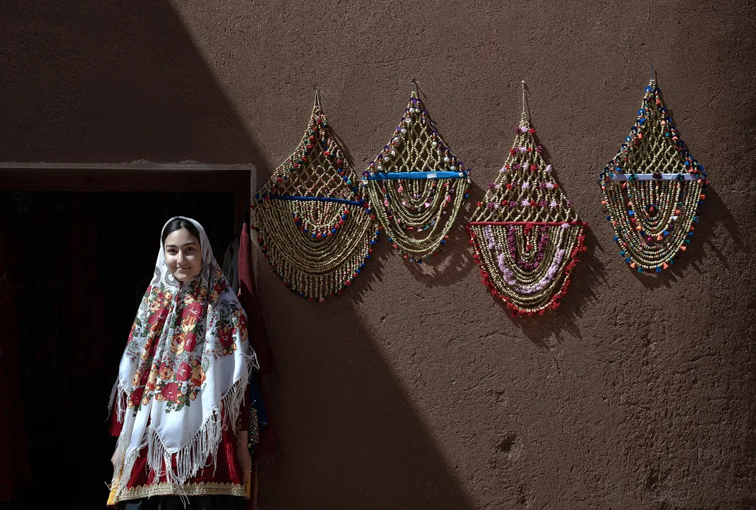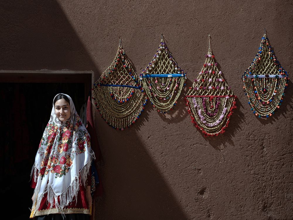 A picture of a beautiful girl in a traditional dress with a beautiful light shining on her face next to a spand hanging on the wall. In Iran, the spand is a symbol of staying safe from prying eyes.