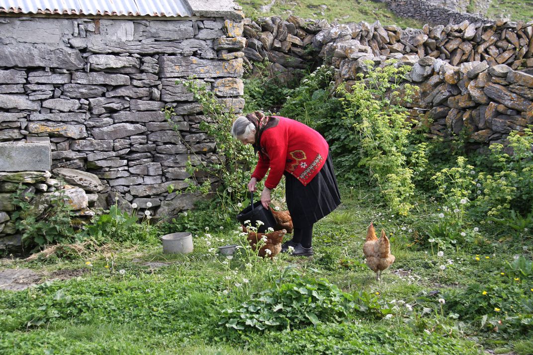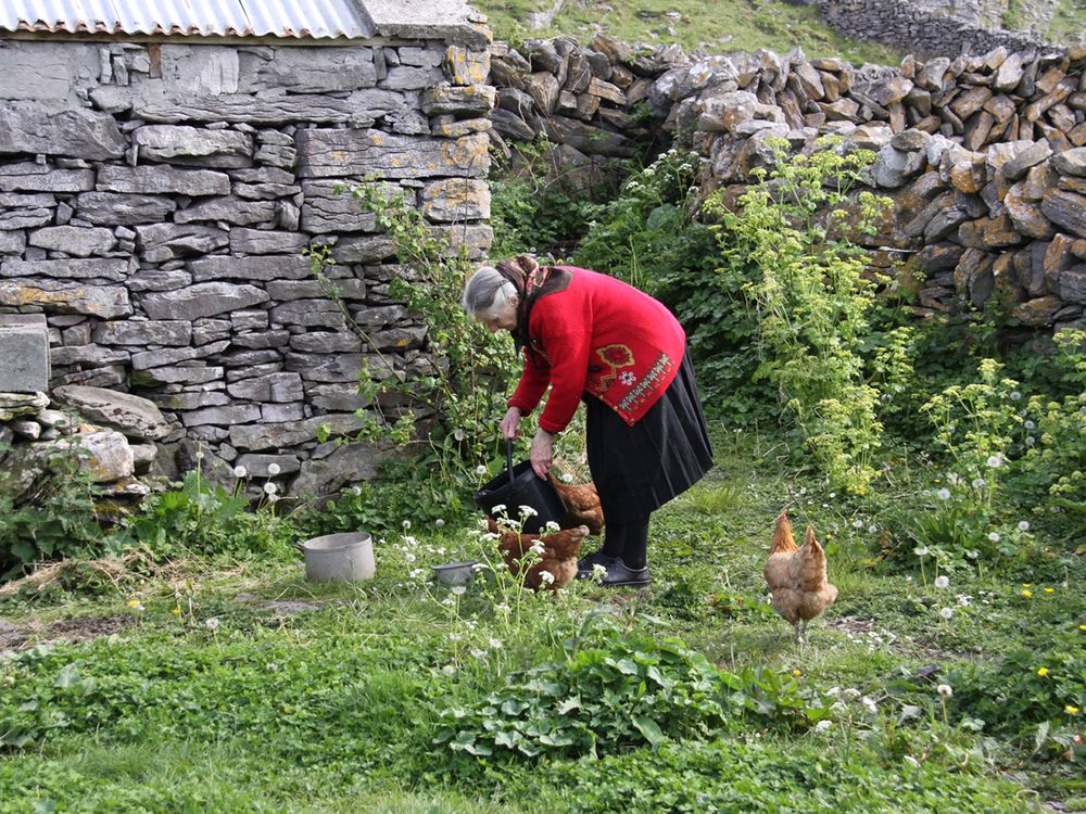 Beautiful Irish woman feeding chickens in her yard on Inishmaan, the second of three Aran Islands off Galway Bay.
