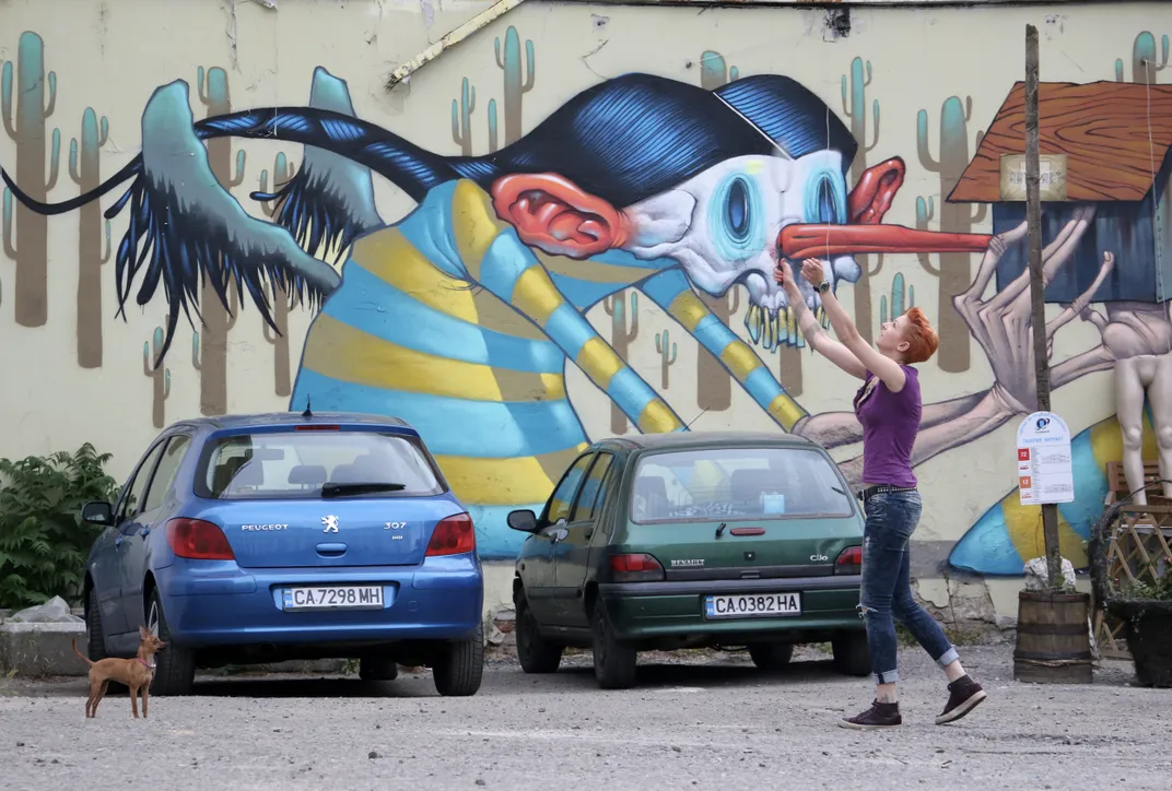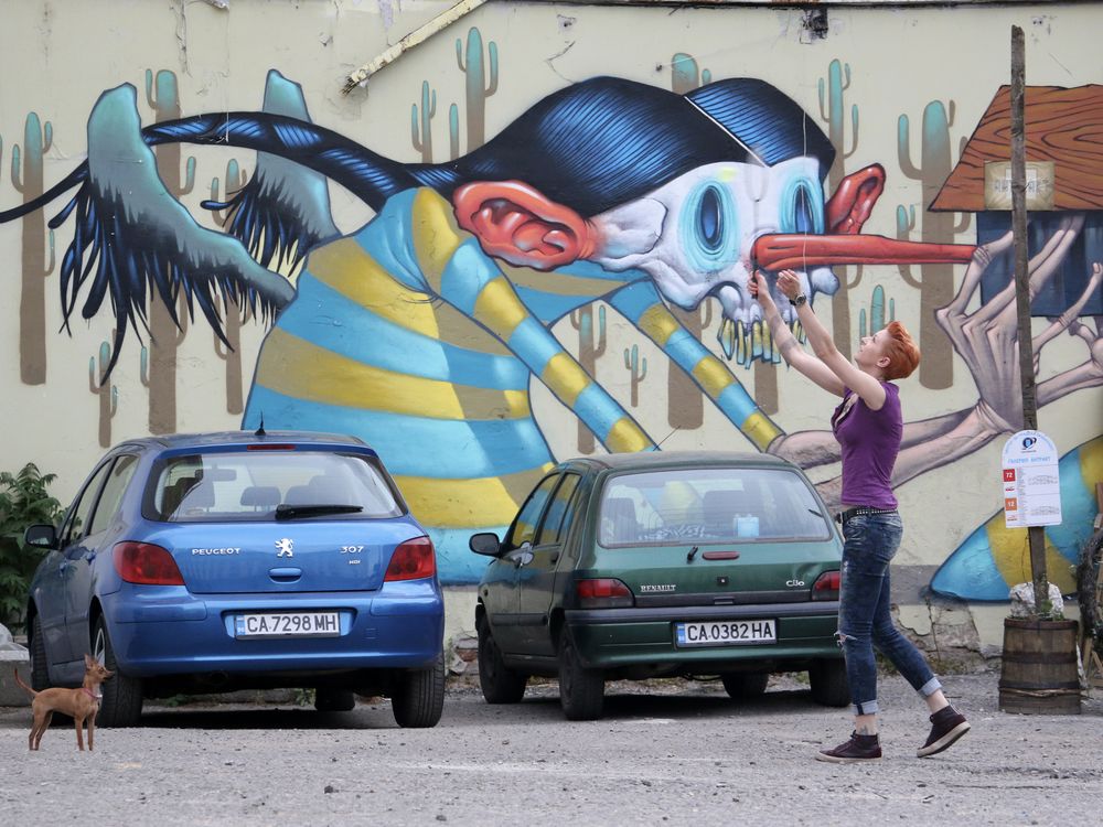 A woman plays tennis with her dog in Sofia, Bulgaria.