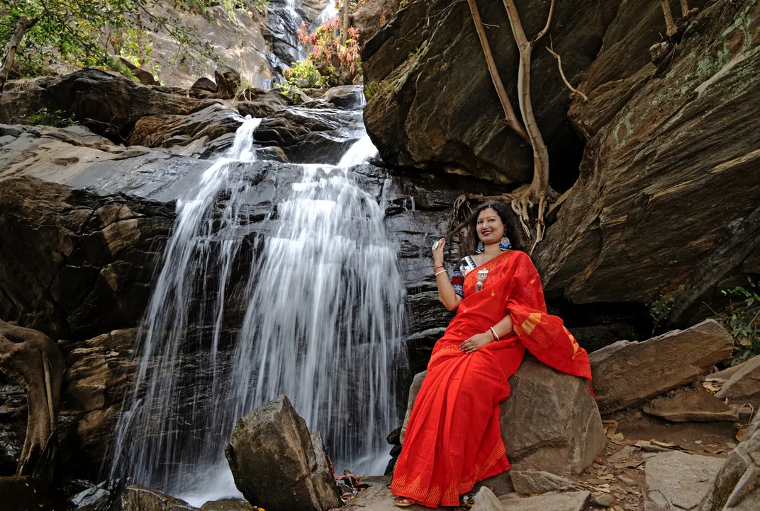 A beautiful lady is enjoying the natural environment, sitting by a spring.