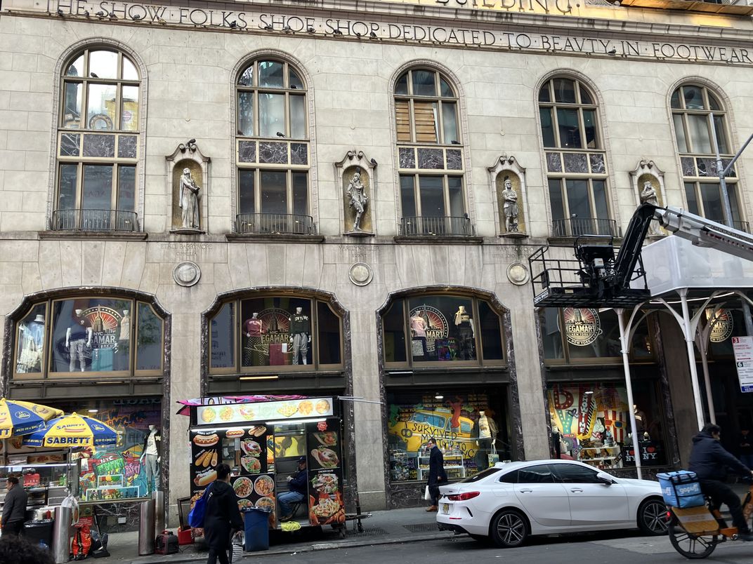 In 1926, I. Miller & Sons' shoe store, had carved, "The Show Folks Shoe Shop Dedicated To Beauty In Footwear" into its stone. Four sculptures of actresses are carved in the alcoves, too. The building is undergoing renovation.
