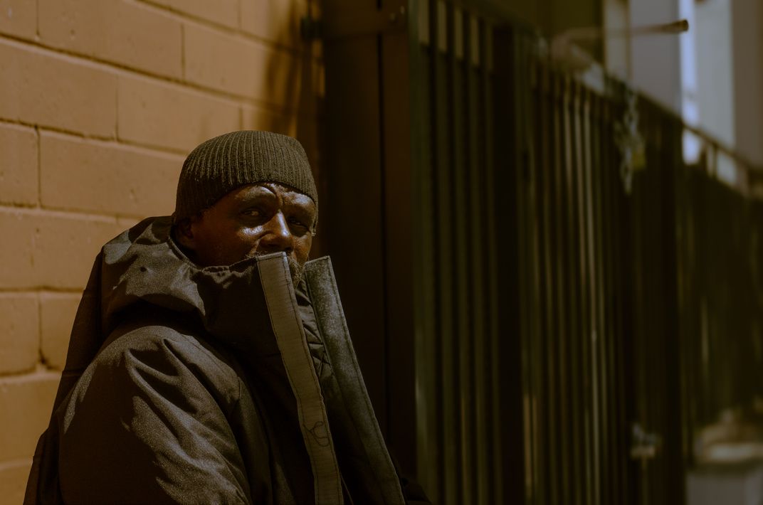 A homeless man with a nice sense of fashion gazes down the street in downtown San Diego.