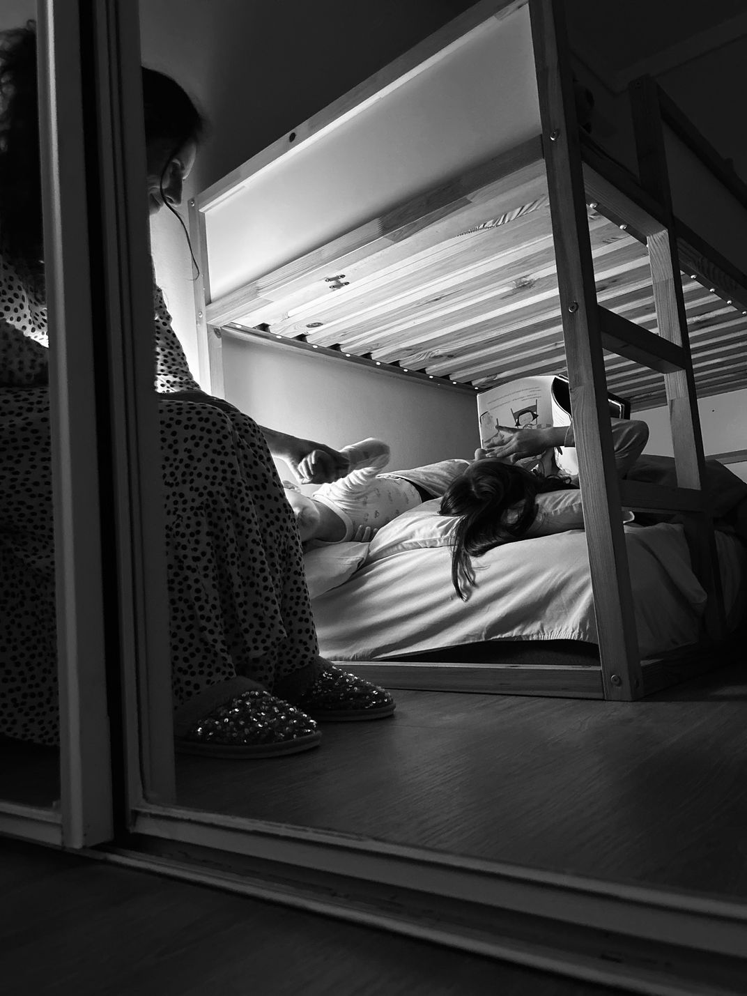 Captured during a family moment while reading a bedtime story. The soft light and reflections create a cozy atmosphere, highlighting the quiet intimacy of the scene.