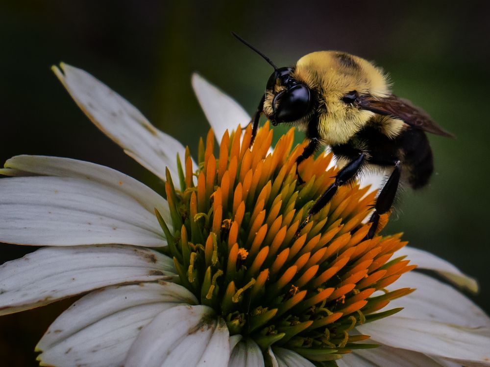 Shortly after sunrise, a bee captured on an aging cone flower.