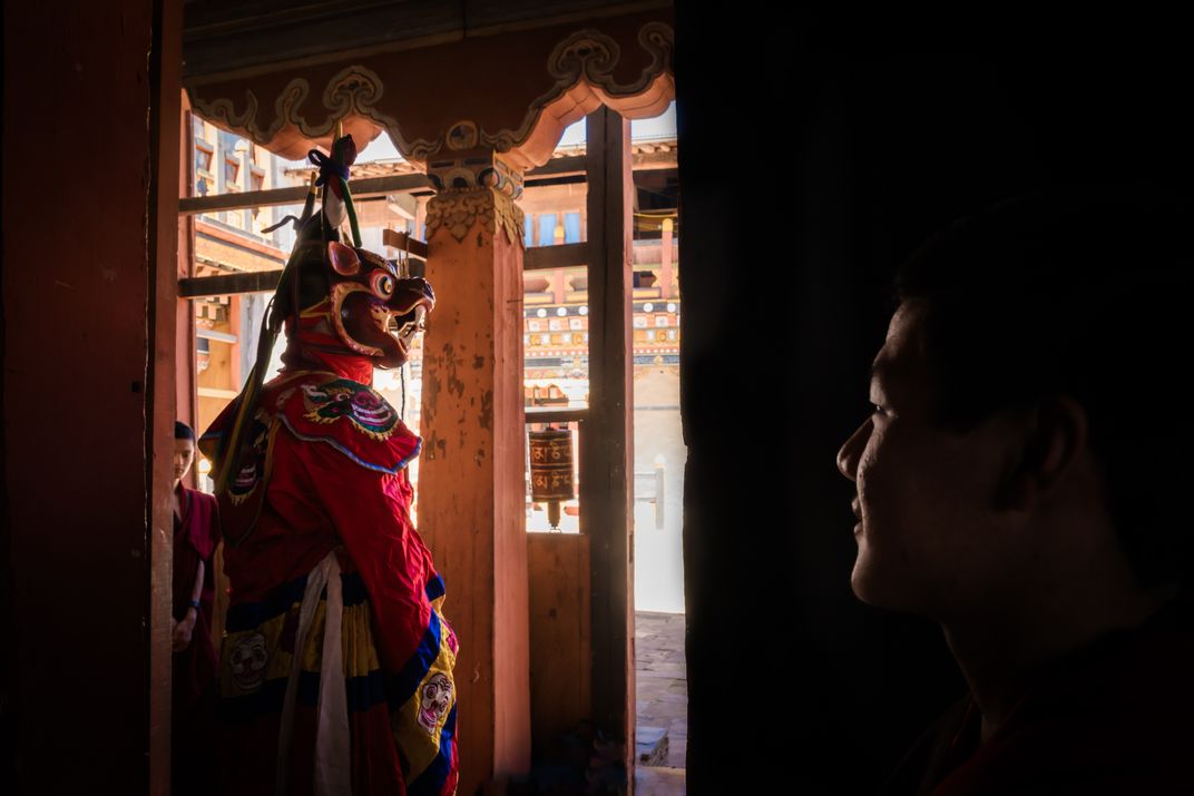 A moment of anticipation, a monk in a colorful mask and costume waits to perform within the walls of a traditional Bhutanese dzong, while another watches silently in devotion. The scene captures the sacred stillness that precedes the dance, bringing Bhutan’s ancient spiritual heritage to life.