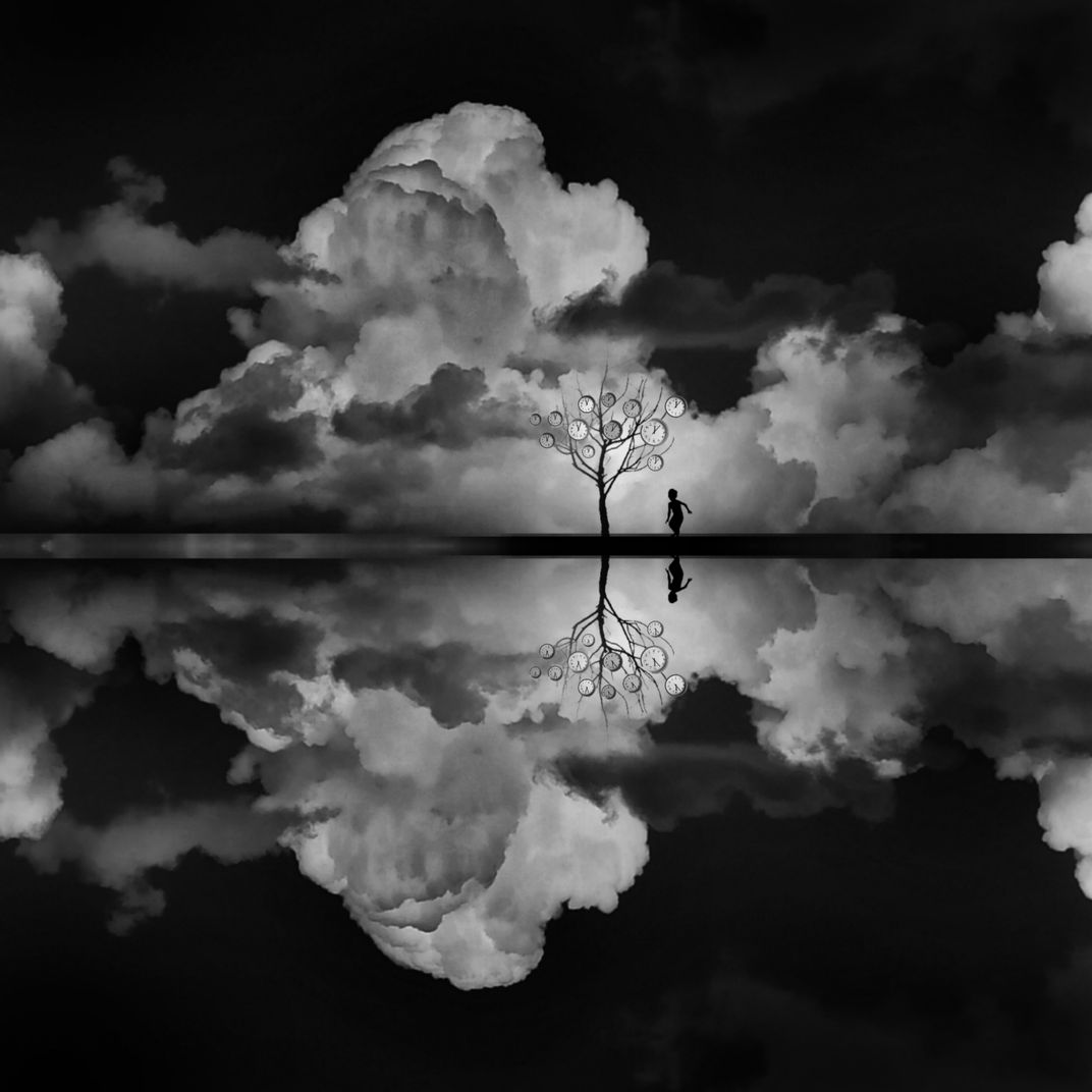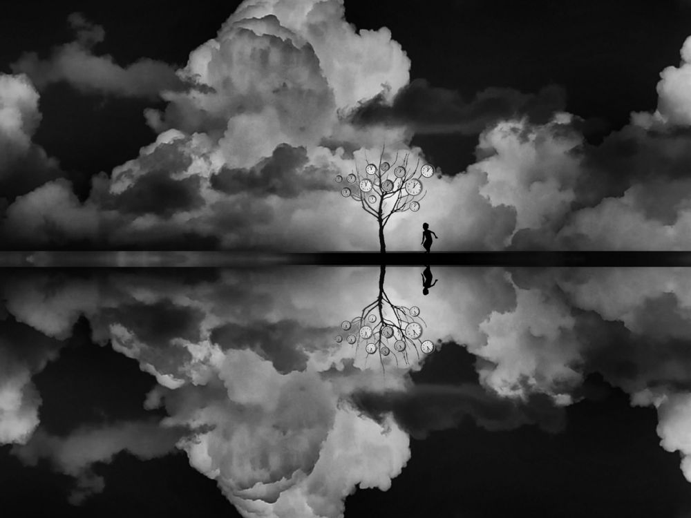Beneath a sky heavy with clouds and upon a ground steeped in silence, a child stands alone. Their small figure, not yet tall enough to meet the branches, gazes upward at a tree whose leaves have been replaced by clocks. This is no tree of blossom or renewal; it is a tree that bears the weight of time itself. Before it stands a child at the very beginning of life — innocence poised against the relentless measure of passing hours. Where there should be play and wonder, there is already the shadow of ticking seconds. Reflected in the still surface of water, the scene doubles into another world — infinite, parallel, without escape. Whether in one realm or the other, the child remains beneath the canopy of time. This work is a meditation on the tension between beginning and end: the child as a symbol of birth and possibility, the tree as a reminder that from the very first breath, we are entwined with the endless cycle of time. The question lingers: do we enter the world already bound by its ticking, or is there still a chance to live before the branches are wholly consumed by clocks?