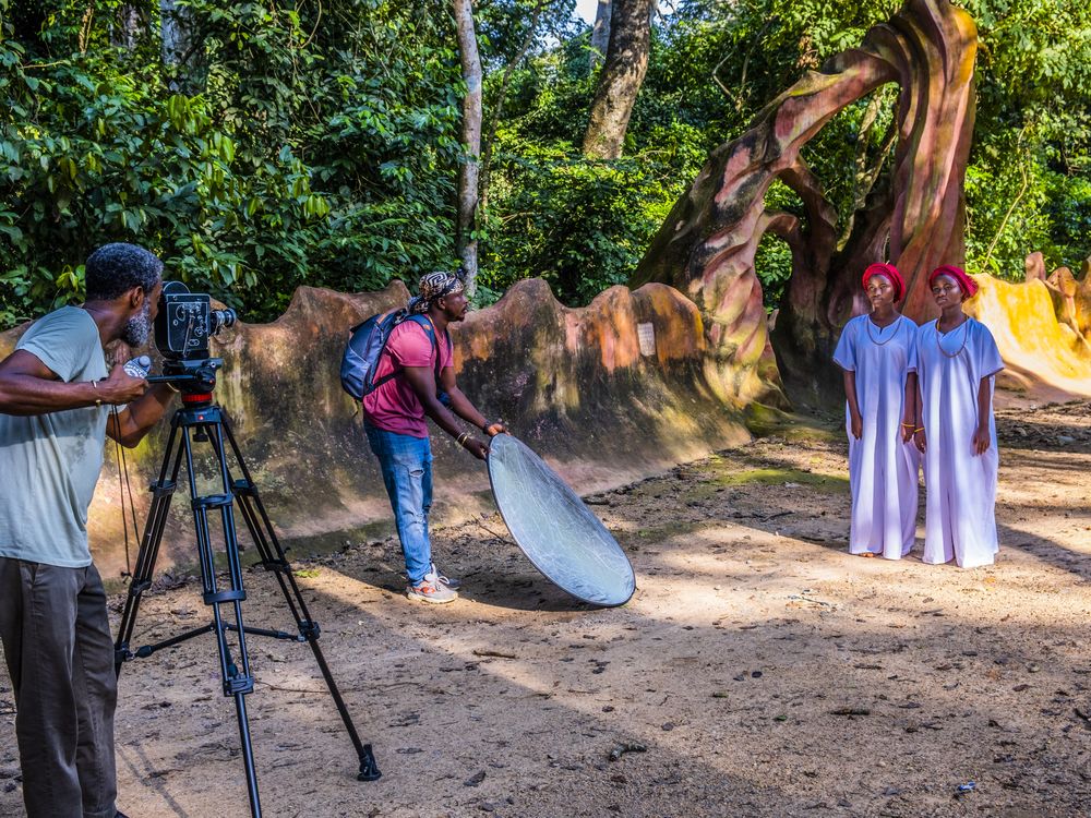 The image shows a filmmaker shooting a set of twins with three motion picture lenses Camera, during a film documentary of the Legendary Lijadu twin sisters from Nigeria who were great musicians performing around the world between 1960s to 1980s
