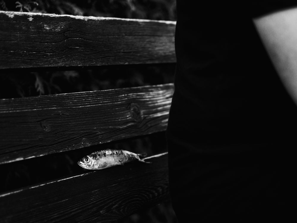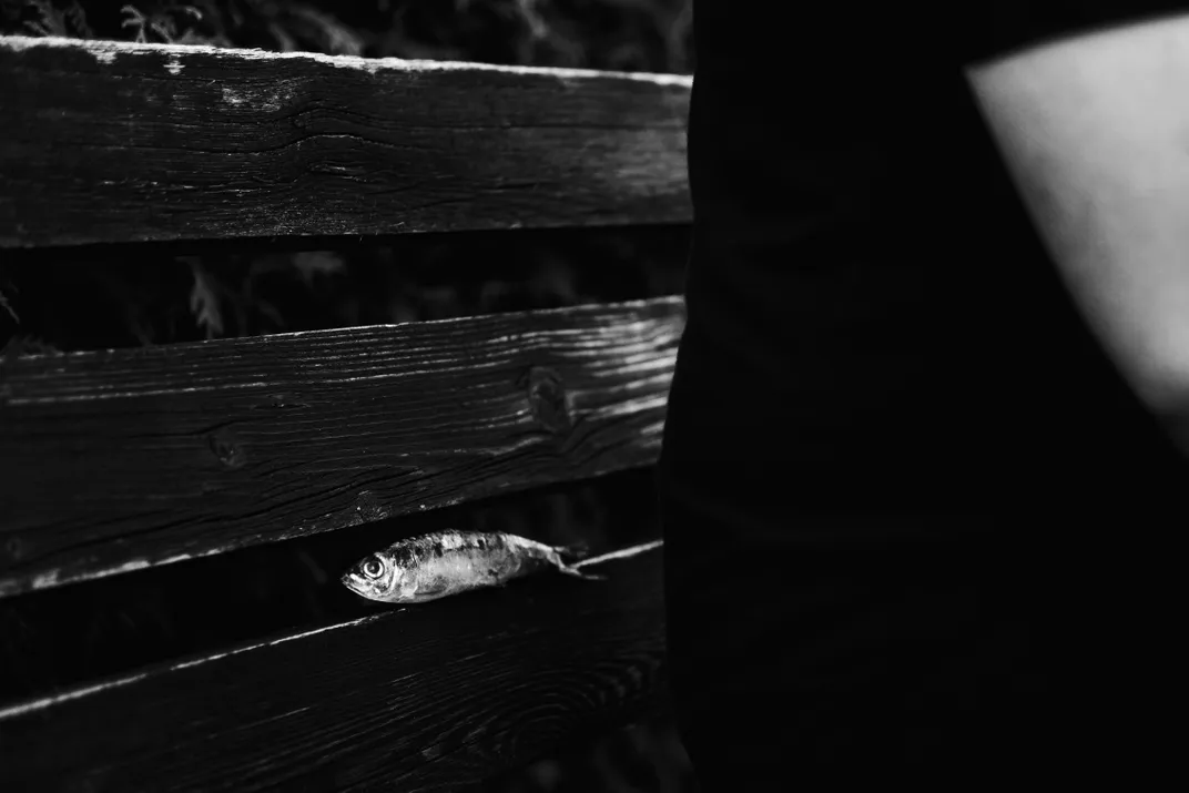A small fish lies between the slats of a bench while a person sits just outside the frame. A quiet scene that feels both ordinary and slightly surreal.
