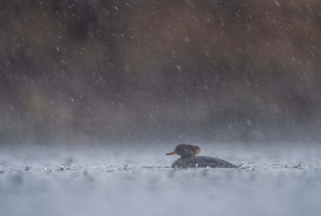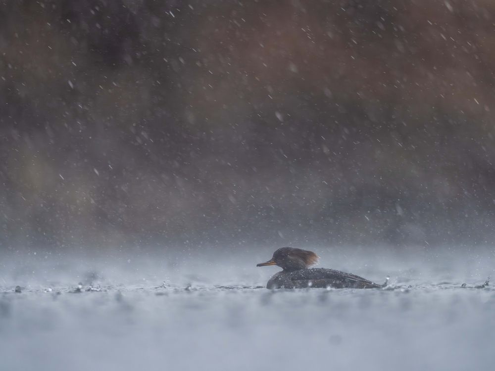Captured from an extreme low angle, this image immerses the viewer into the frigid environment of a winter wetland. A female Hooded Merganser (Lophodytes cucullatus) floats low on the water, its small form composed and resilient against the muted, blurred background. The dramatic mood is set by the heavy, visible streaks of falling snow or sleet, which create a dense curtain of white, reducing the world to a powerful study in cool tones and texture. The resulting photograph is an artistic portrayal of quiet endurance, illustrating the unwavering persistence of wildlife in the face of challenging elements.