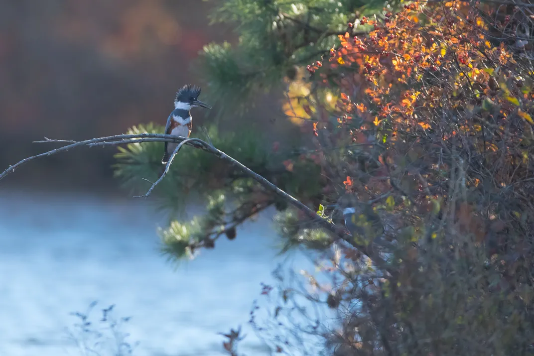 Easy to hear, but difficult to spot, this female belted kingfisher managed to pause on a branch long enough for me to take her picture. The autumn leaves perfectly compliment the colors of her plumage.