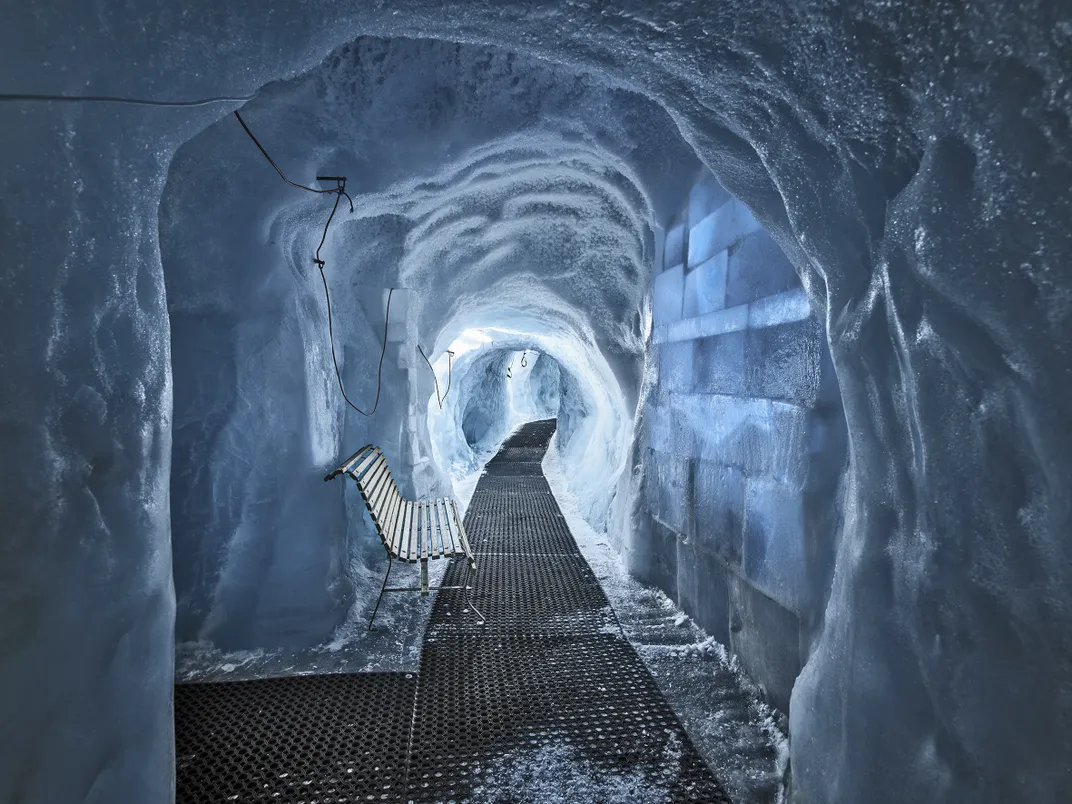 A surreal situation in the ice. From the bench, you can see blocks of ice in the glacier, but it is impossible to see into the distance.