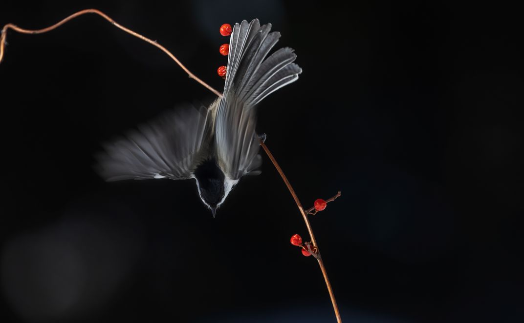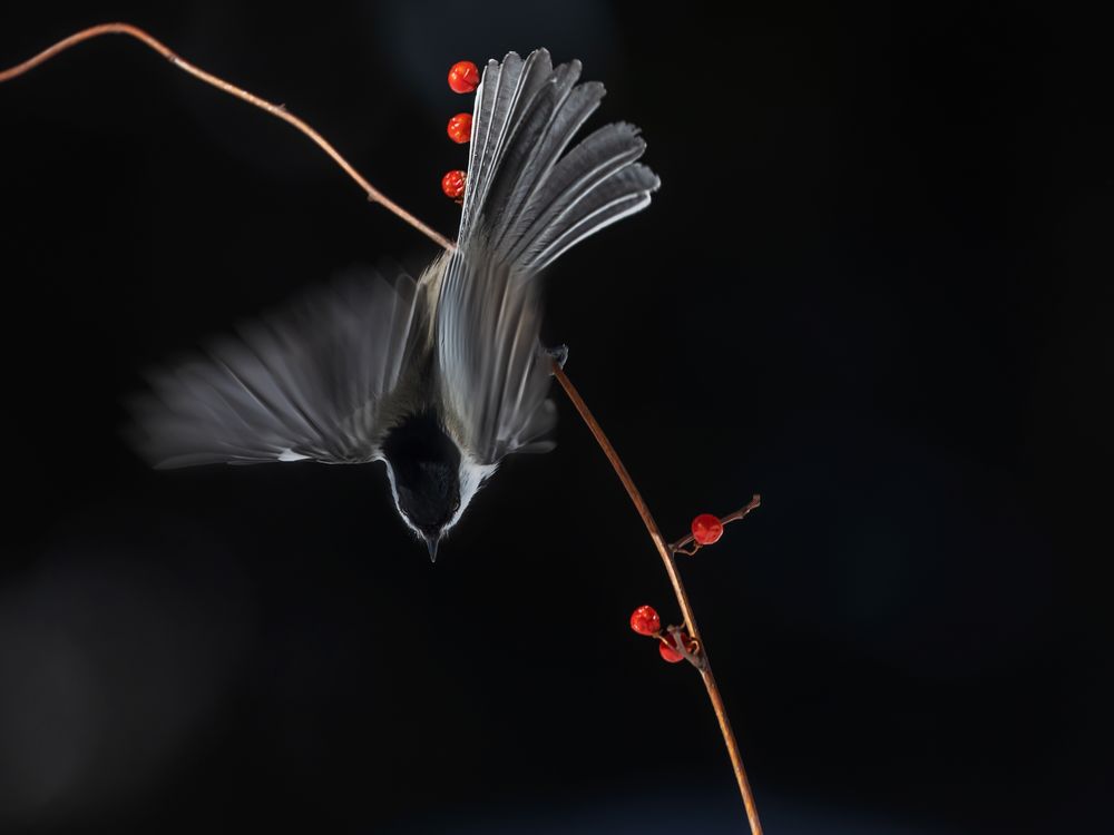 A chickdee and a red berry put all together to present a simply composition in a winter day in natual wildlife environment.