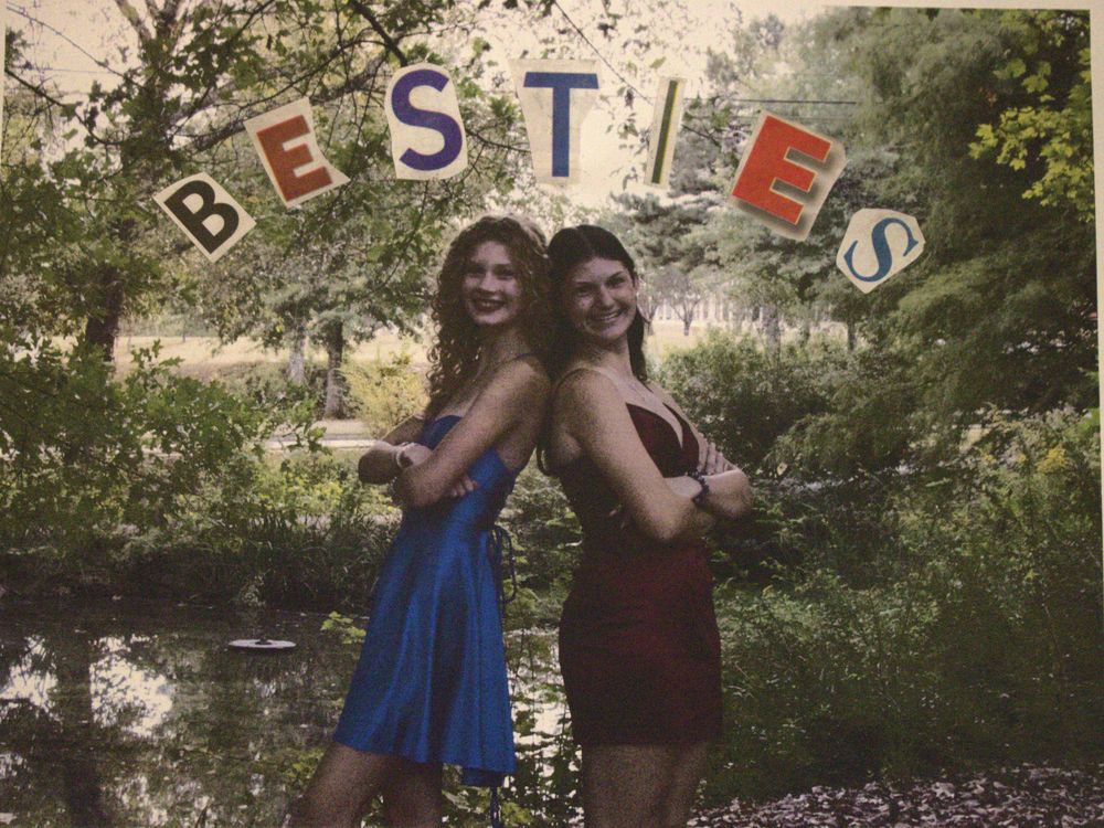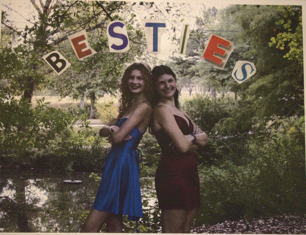 This is a picture of two best friends before their senior year homecoming dance. It encapsulates just a moment of pure bliss in each others company with a warm fil like tint. There is also a partial collage with the letters spelling BESTIES.