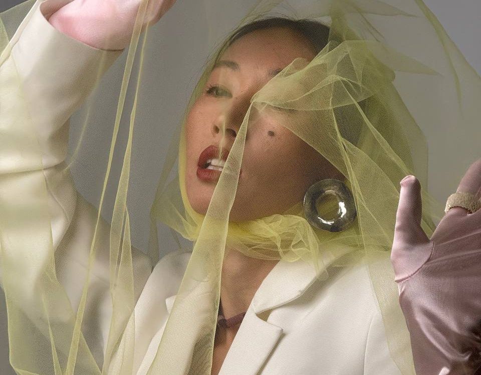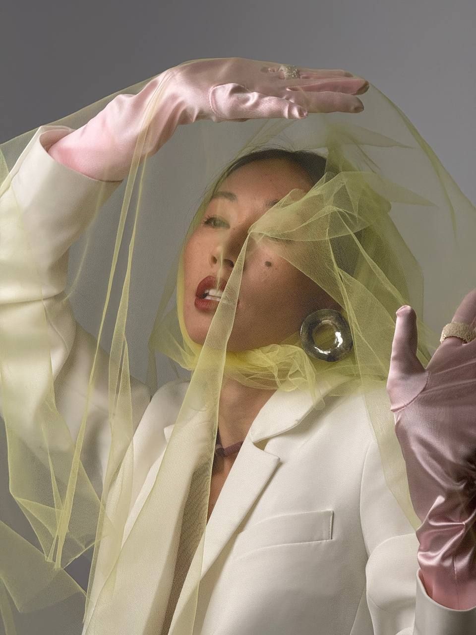 This conceptual portrait explores the tension between visibility and concealment. The yellow veil becomes a metaphor for fragile boundaries — between inner calm and external noise, between vulnerability and strength.