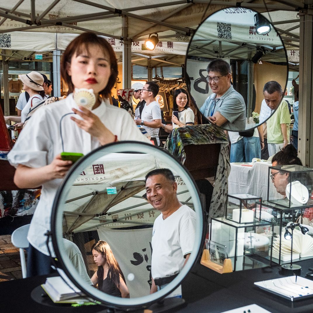 In the bustling market scene, the mirror serves as a unique perspective, reflecting the different states of the characters. Shot on July 6, 2024, in Jingdezhen, Jiangxi Province, China.