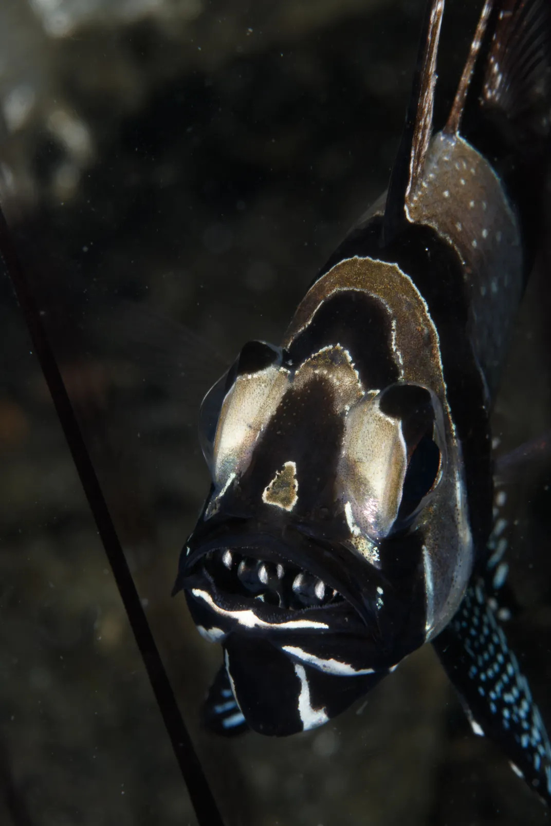 A male Banggai cardinalfish was sheltering his newborns inside his mouth, a scene captured in the shallow waters of Indonesia. The curious fry peek out, eager to explore the world, while their cautious father kept them safe from unseen dangers.