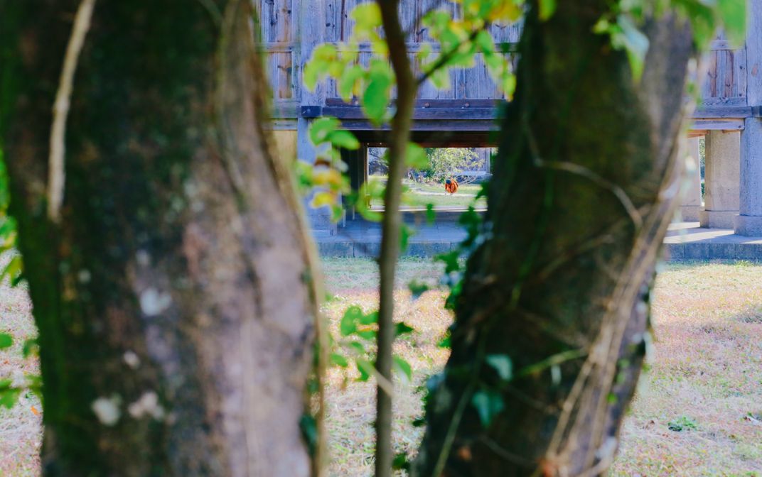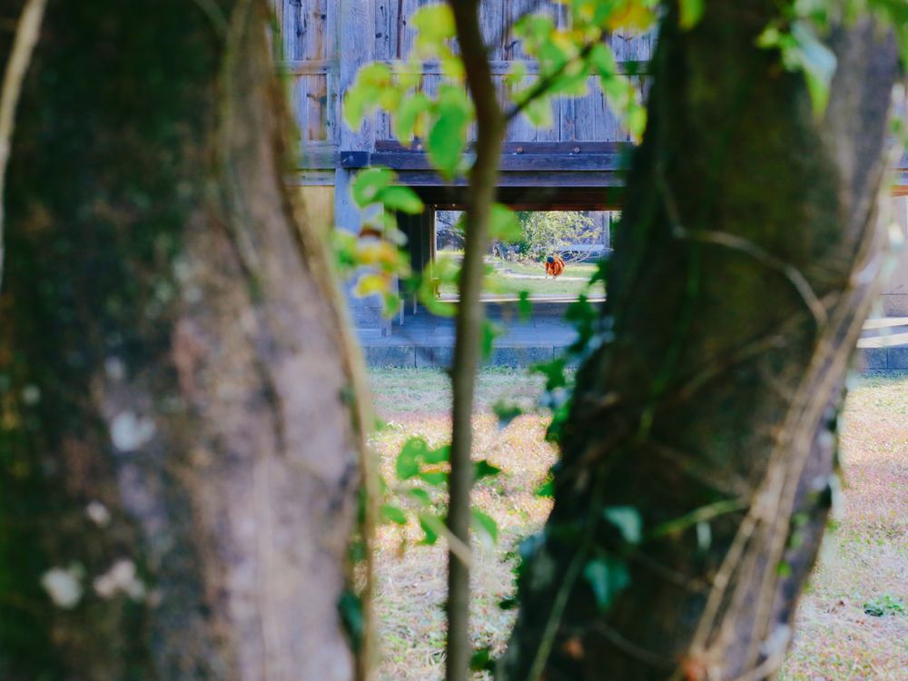 Photographed at a Buddhist temple in Seogwipo, Jeju Island, South Korea. Through the temple's entrance gate, a Southeast Asian monk goes about his daily work in the outer courtyard. The image captures the intersection of sacred and everyday life—where spiritual practice meets routine labor, and the temple threshold marks the boundary between contemplative space and the world of tasks and duties.