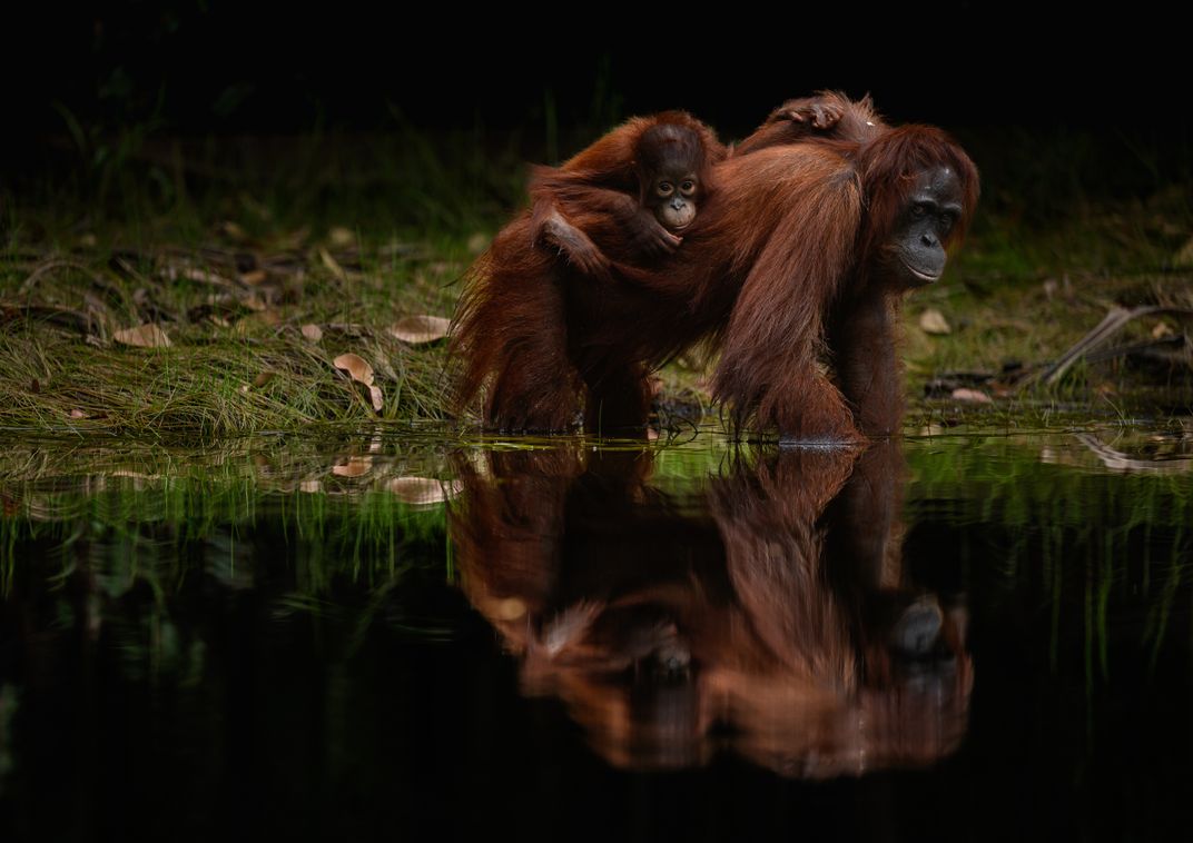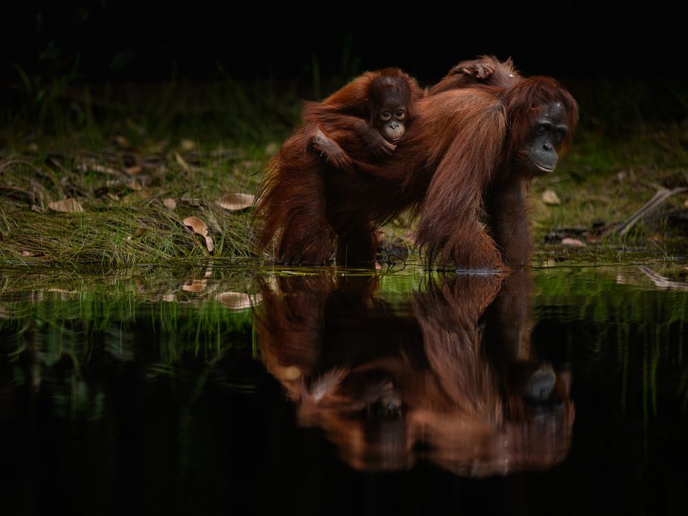 In the quiet of the forest, this mother and infant are caught between reflection and reality—much like their species is caught between survival and extinction. Orangutans now exist between two worlds: the wild they've known for millennia, and an uncertain future shaped by human hands. As palm oil plantations continue to fragment their habitat, these great apes are running out of space, out of time.