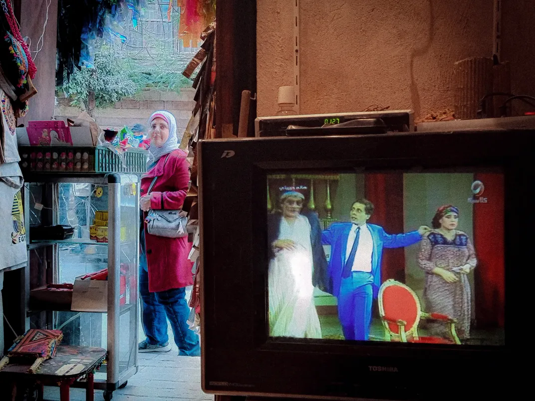 Between Two Worlds: Where is the warmth found? A woman stands at the threshold of a shop, a participant in the fast, strict, and emotionally cool reality of the day. Next to her, the old screen radiates a dramatic glow, charged with the warmth of the past, its comforting narratives, and rich, deep emotions. The image captures a moment of pause where the cool tones and silent movement of lived reality contrast sharply with the beloved clamor and overwhelming feeling of the vintage TV’s world, prompting a question about the heart’s true refuge.