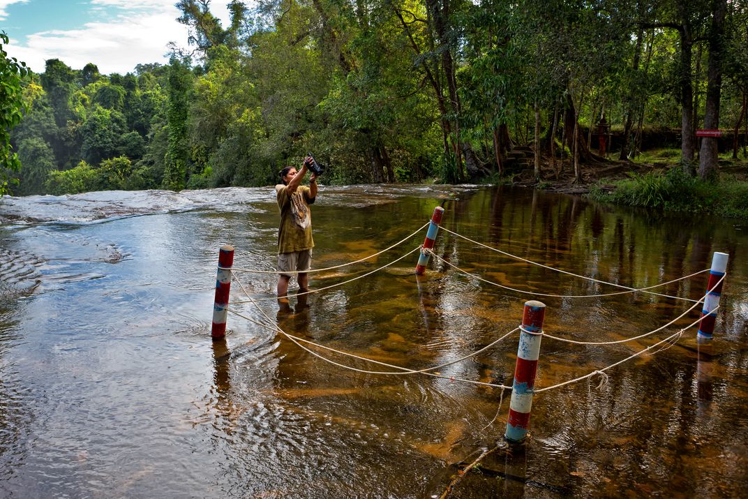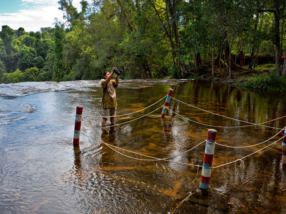 My wife waded out to get some video of the linga (statues) under the water at the top of the waterfall in the Kulen Mountains, Cambodia.