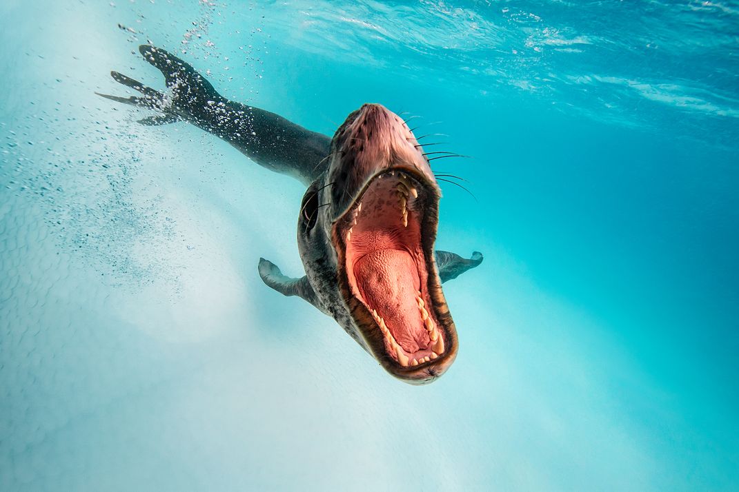 The leopard seal sees its reflection on my camera lens and thinks there is another seal trying to capture territory. I was scared by its really big mouth and sharp teeth.