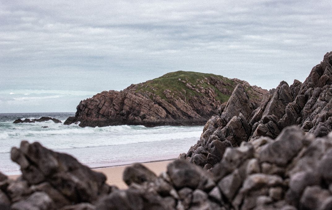 I took this photo on one of the coolest beaches in the world. Surrounded by cliffs, this beach features a large rock formation jutting out into the ocean.