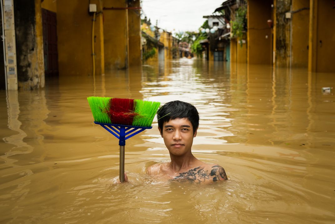 Bình, 24, holds a broom outside his home in Hoi An, Vietnam during the October 2020 flooding. Leaving his home in Northern Vietnam, Bình came to Hoi An to open a coffee shop and start a new life. Due to COVID tourism dried up but he stays positive.