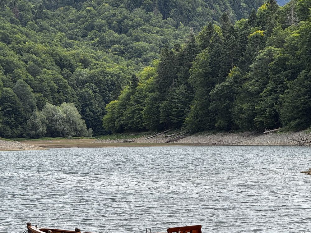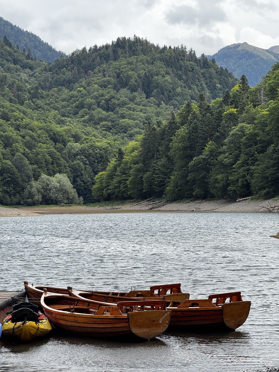 A tranquil scene at Biogradsko Jezero, a beautiful glacial lake nestled within Montenegro's pristine Biogradska Gora National Park. Traditional wooden rowboats rest on the water's edge, ready for visitors to explore the calm surface, surrounded by one of Europe's last remaining primeval forests and the majestic peaks of the Bjelasica mountain range.