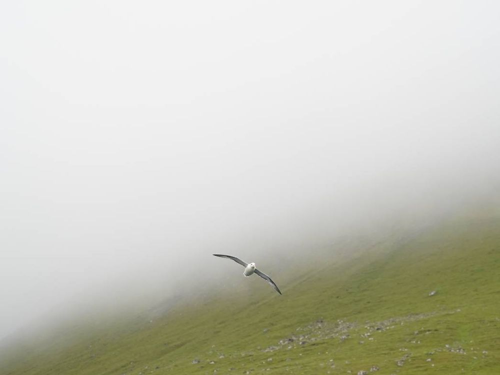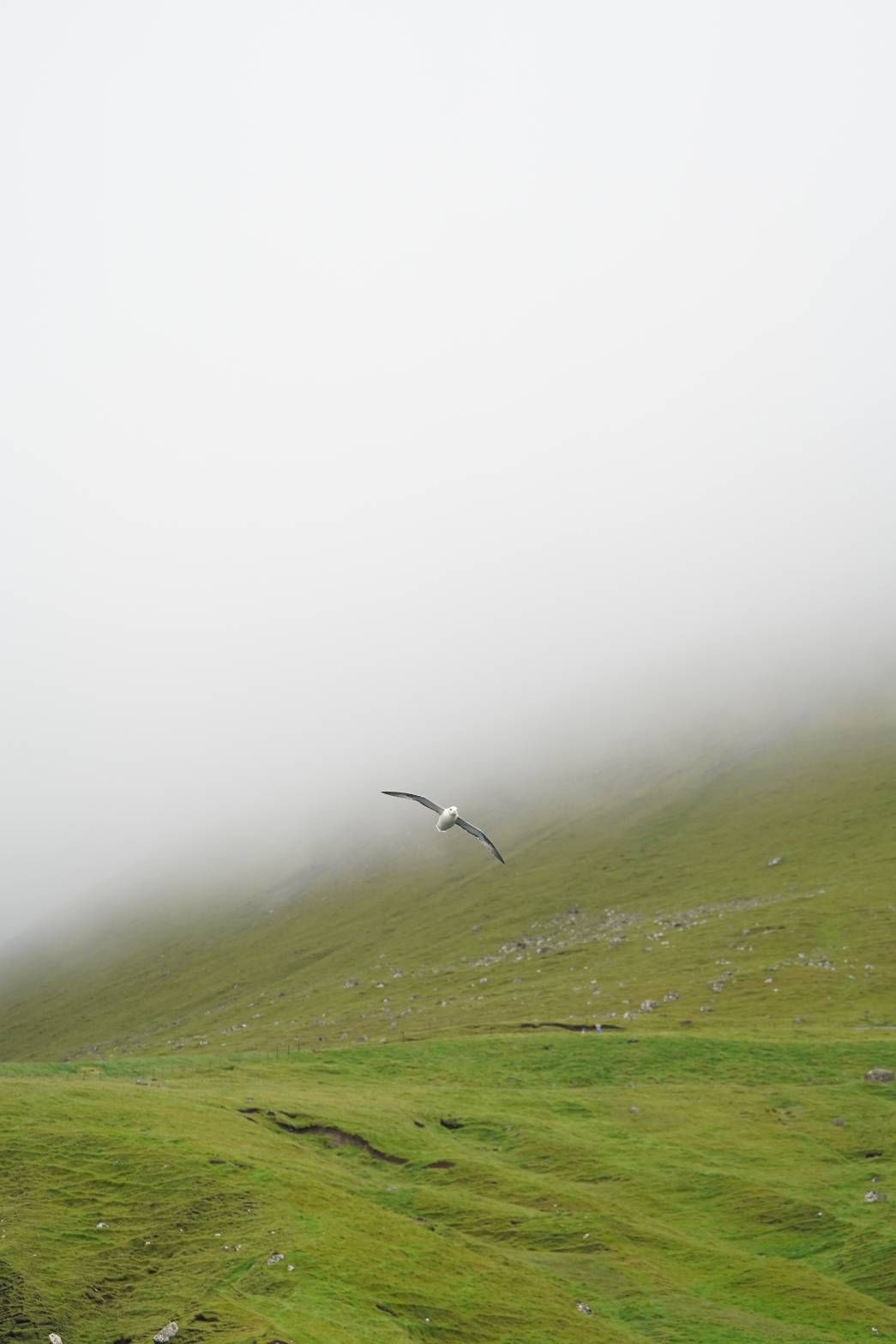 A seabird glides through a veil of fog above green cliffs, wings steady and silent. The contrast between motion and stillness evokes the spirit of freedom along the northern coast.