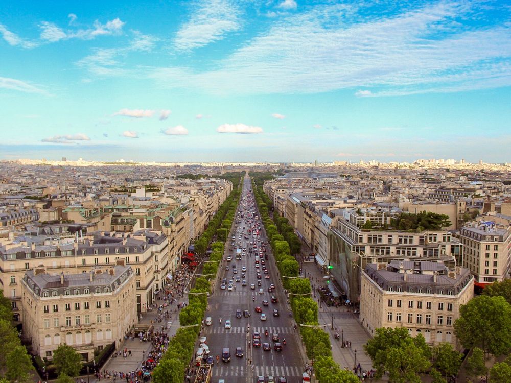 Atop the Arc de Triomphe, the Champs-Élysées was bustling with people as they went in and out of stores in Paris, France.