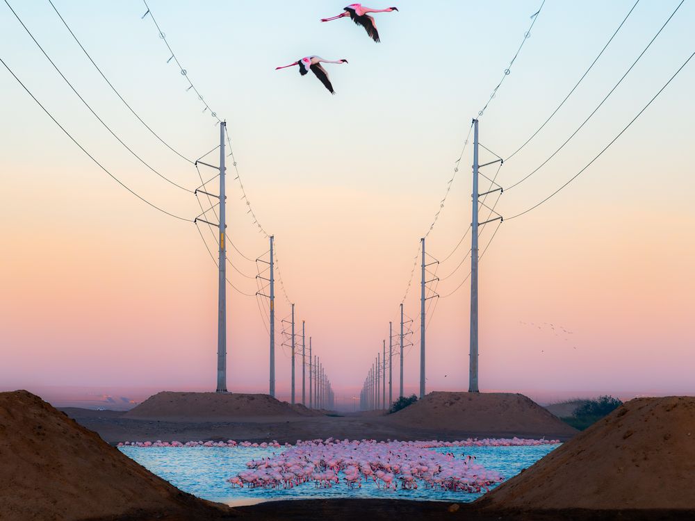 This image, taken in Walvis Bay, Namibia, captures the delicate grace of flamingos in what is ironically called a "bird sanctuary". The flamingos are juxtaposed against the stark intrusion of human activity: looming power lines, piles of earth, and nearby wastelands. It is a commentary on the uneasy coexistence of nature and human progress, where even sanctuaries are not immune to the spread of urban and industrial sprawl.