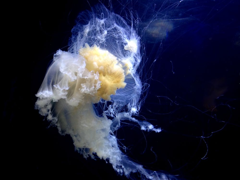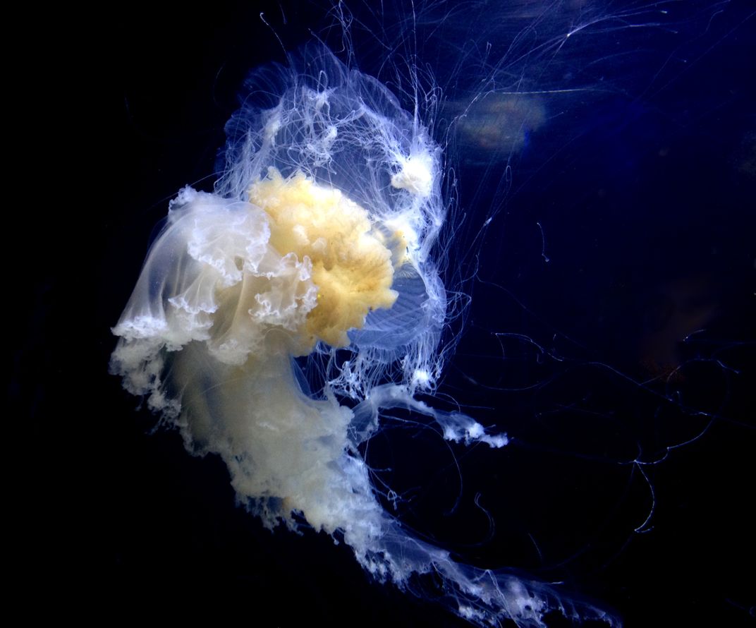 An egg yolk jelly swims at Aquarium of the Bay in San Francisco.