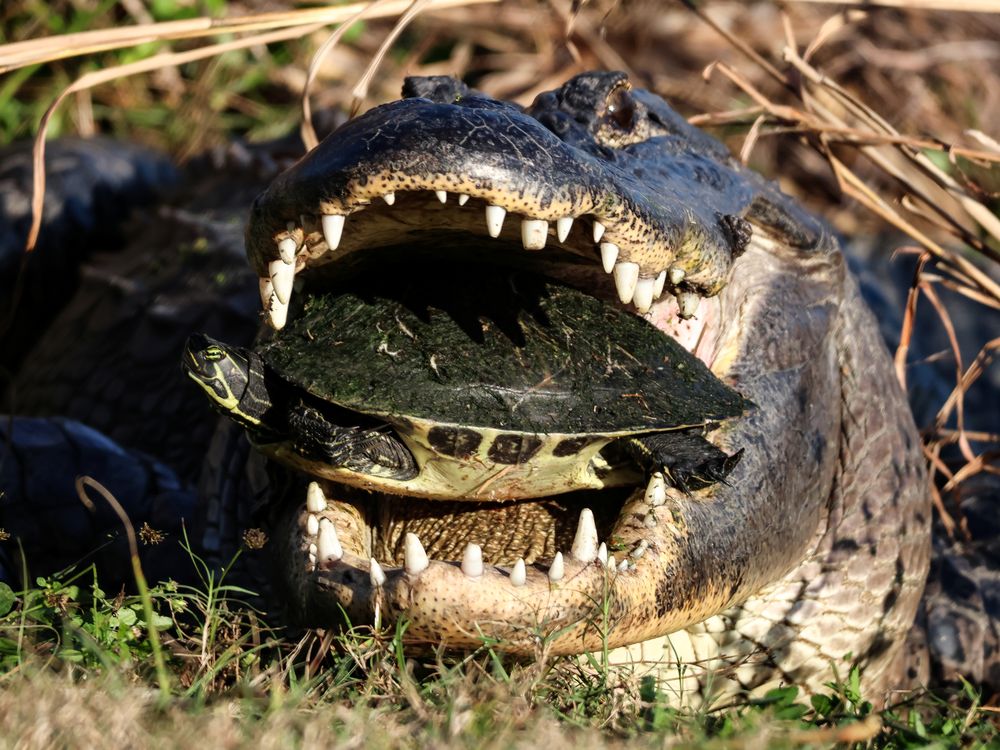 An alligator attempts to crush a turtle in its powerful jaws.