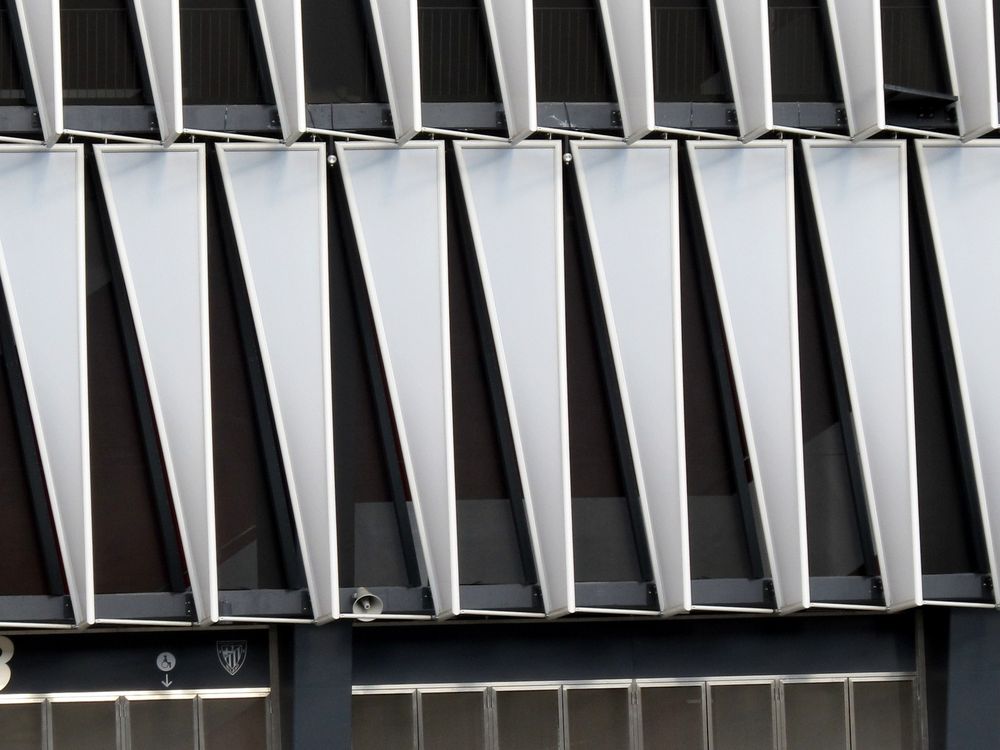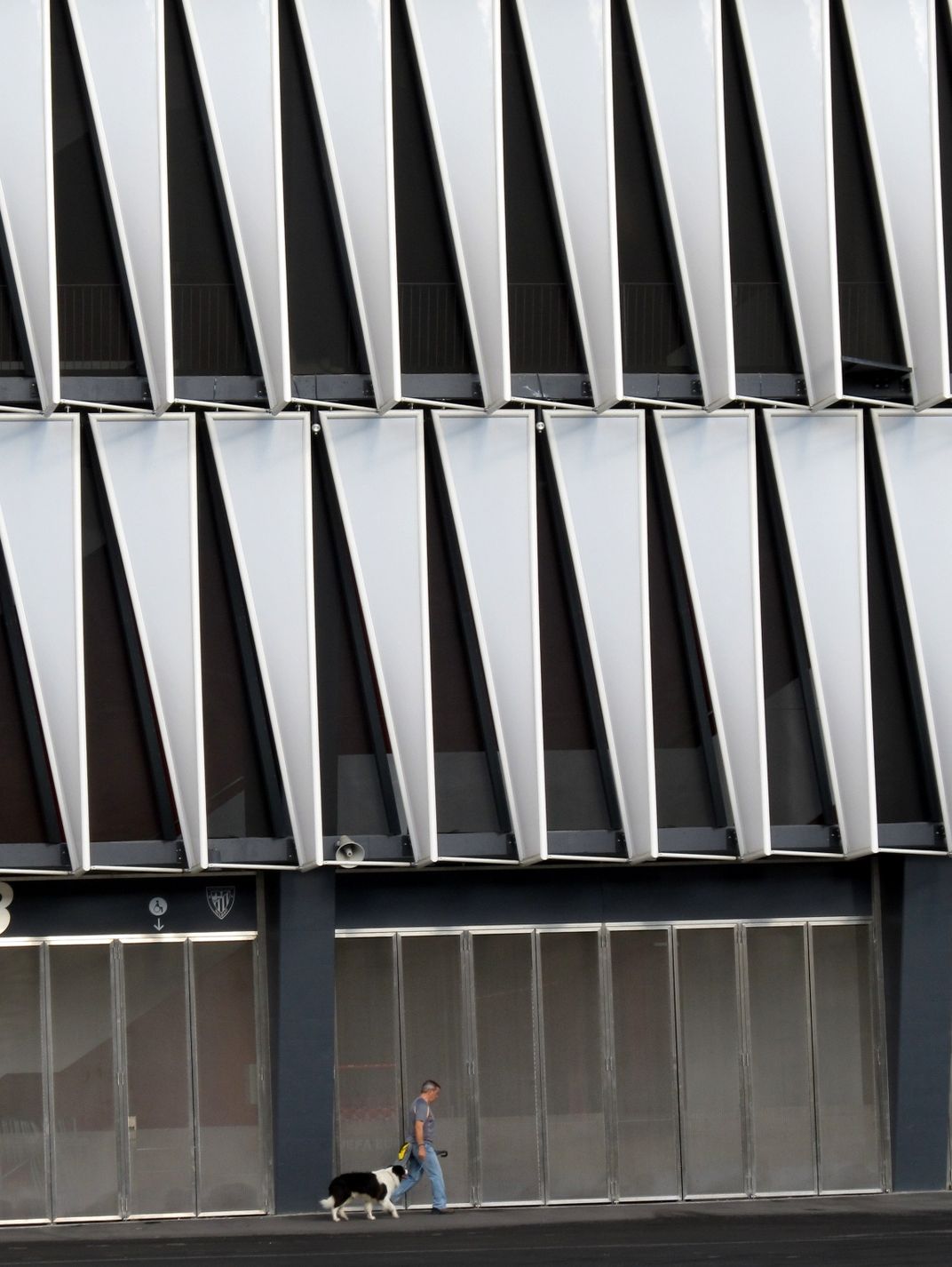 A man walks his black and white dog beneath the black and white siding of the Bilbao soccer stadium.