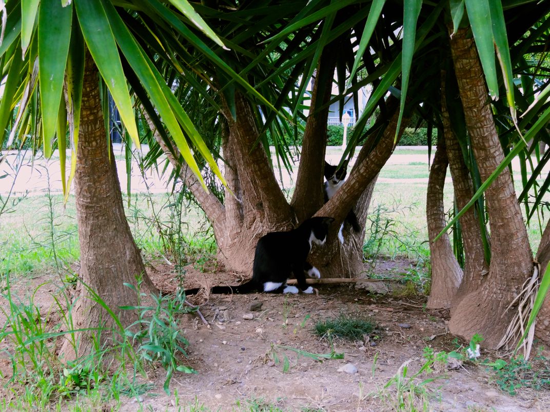 Two black-and-white kittens are playing around near trees. The are siblings. One of them is looking down at the ground, while another is looking in the camera, spotting the photographer.