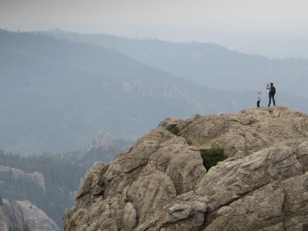 Black Elk peak (formerly Harney Peak) in the Black Hills of South Dakota is a 2 hour hike that ends in a spectacular view for miles around. Here a dad and his brave daughter take in the view from the top on this hazy day.