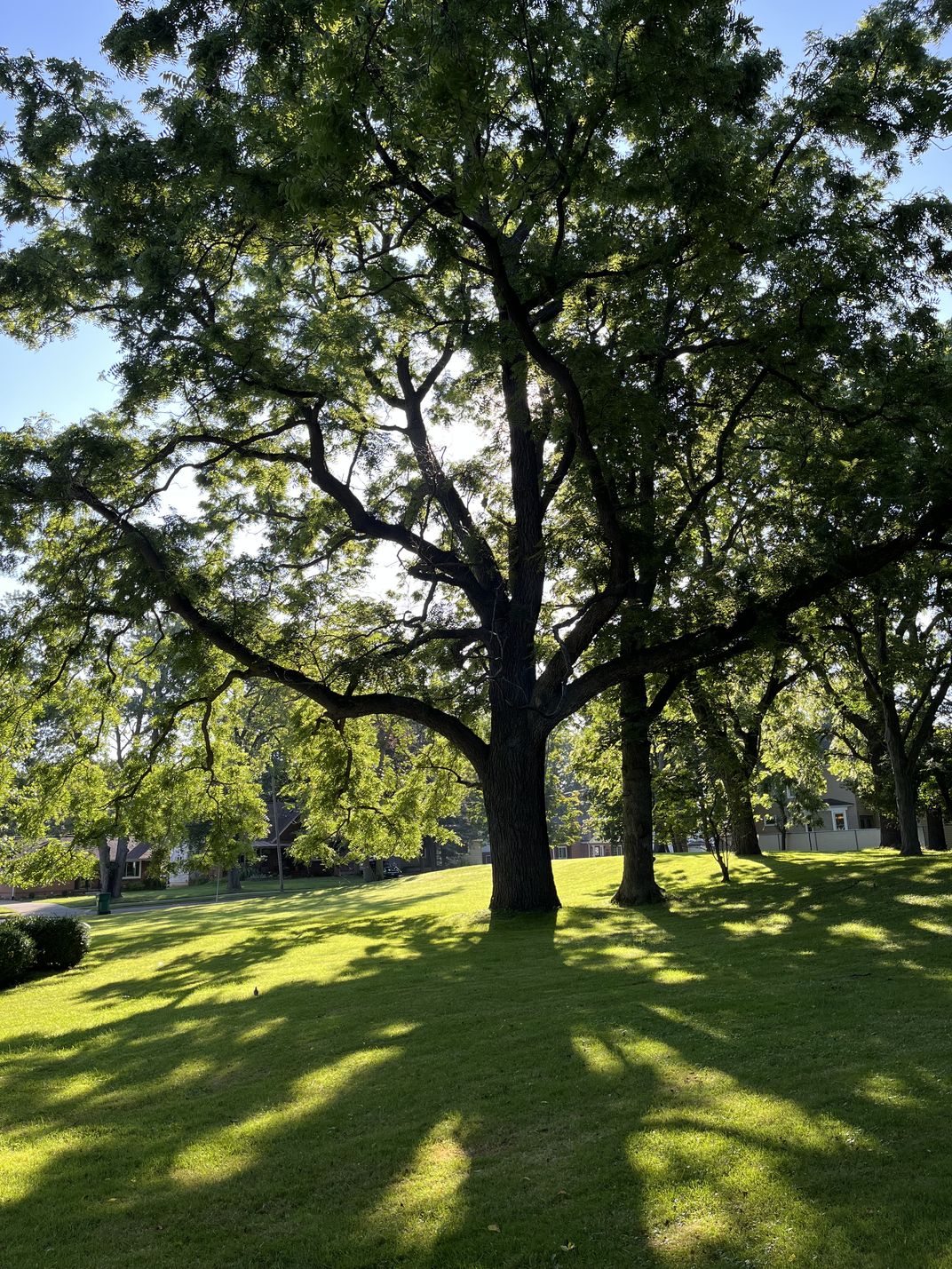 A splendid centuries-old black walnut tree stands sentry at Buffalo's Seneca Indian Park, an ancient burial mound. The mid-morning sun on an early August day used the tree's sturdy frame to create a deep, prominent, sloping shadows.