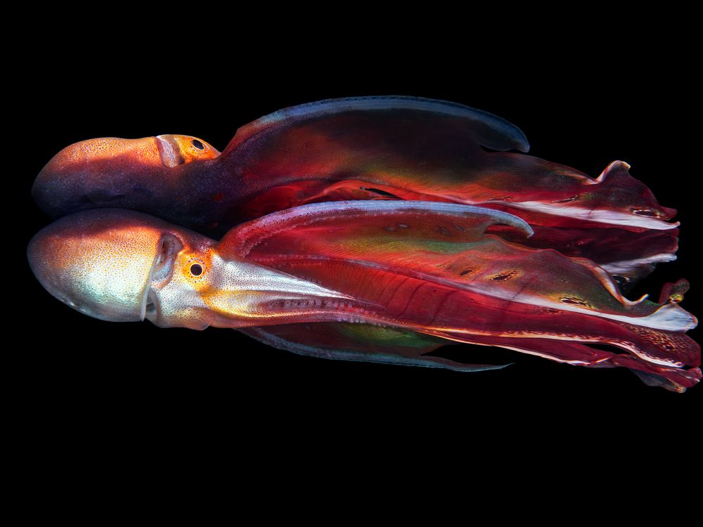 A female blanket octopus with its blanket unfurled near the surface of the ocean on a calm day in Anilao, Philippines.